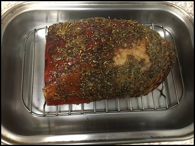 The roast was taken out a half hour earlier and warmed to room temperature. While the oven was heating, it was seasoned with kosher salt, freshly ground pepper, rosemary, and crushed garlic. Seasoning with garlic powder, salt and pepper would work too.